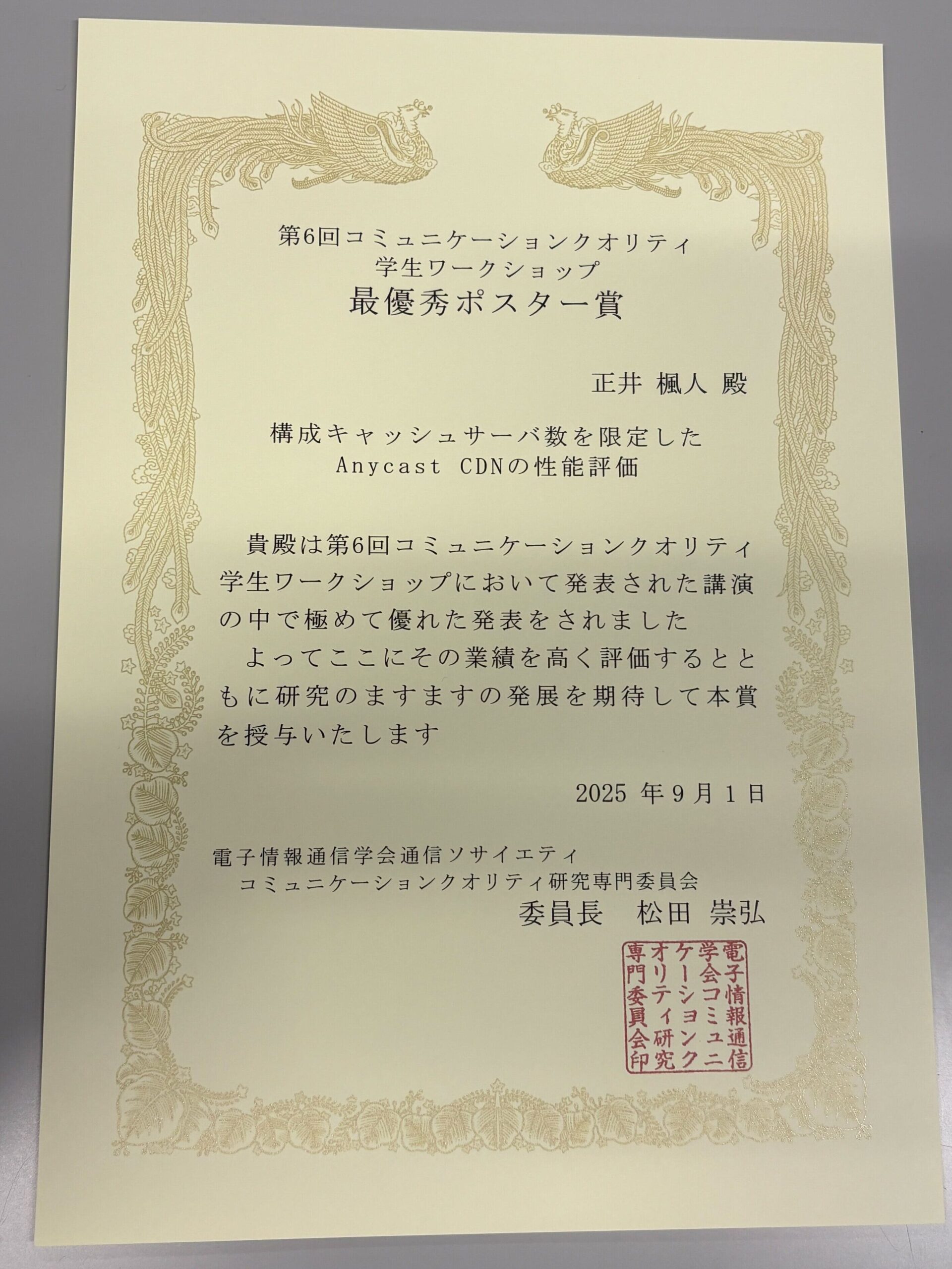 2025年8月30- 9月1日に山梨県の西湖で開催されたCQ学生ワークショップにて、”構成キャッシュサーバ数を限定したAnycast CDN の性能評価” というタイトルで発表しましたので、報告させていただきます。