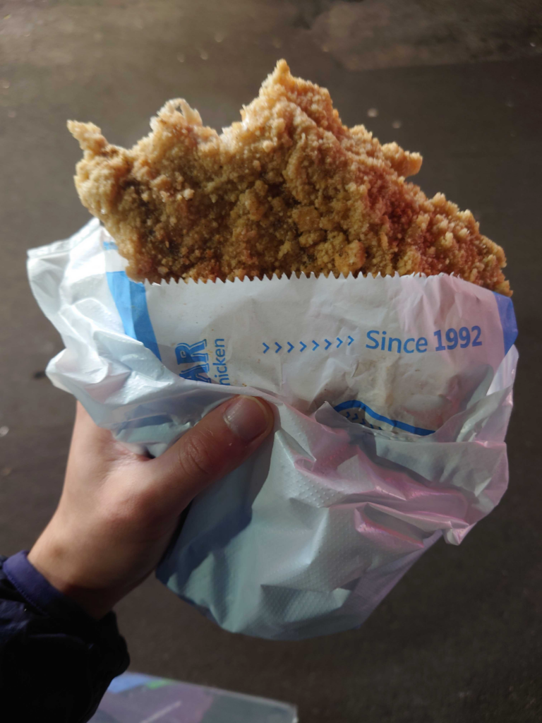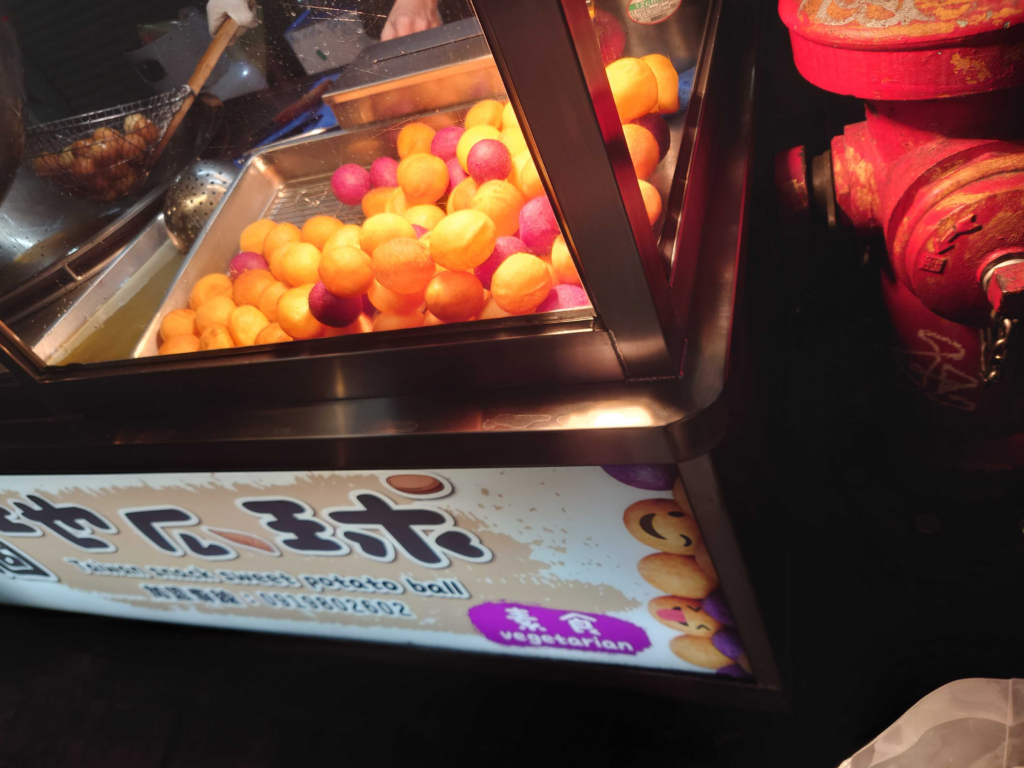 夜に台北の士林夜市を観光しました.士林夜市は有名な夜市の一つだったため,多くの観光客がいました.ちょうど日本の高校生が修学旅行で訪れていたこともあり,日本だと錯覚するくらい日本人が多かったです.出店で売られている食べ物をいくつか食べたのですが,芋を揚げたスイーツが美味しかったです.チキンは一つでおなか一杯になったのに500円ほどで、とても安くて驚きました.